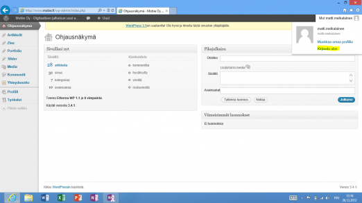 Olet nyt vaihtanut salasanasi ja suorittanut tarvittavat alkutoimenpiteet. Voit jatkaa työskentelyäsi lukemalla seuraavat kappaleet tai poistua järjestelmästä viemällä hiiren sivun oikeassa ylänurkassa näkyvän käyttäjätunnuksesi tai nimesi päälle ja valitsemalla avautuvasta valikosta ”Kirjaudu ulos”. Muista että kun poistut järjestelmästä, sinun tulee aina kirjautua siitä ensiksi em. tavalla ulos.