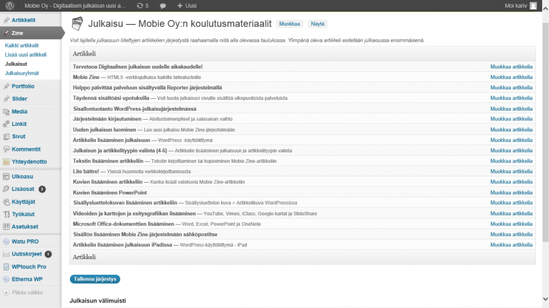 Raahaa artikkelit haluttuun järjestykseen julkaisujen hallintanäkymässä. Klikkaa kuvaa suurentaaksesi!